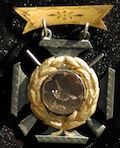 Small brass 1916 enameled clay pigeon medal. The medal was given out at a trapshooting event in Eastern Illinois. | |