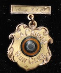 Gold and enameled 7.7 gram Davison Gun Club medal. The medal measures 5/8"x5/8". The back is engraved "Annual Season Trophy 1888. The medal was probably attached to a chain from a loop on the top. A well made fob with small sterling rectangles on the edges. | |